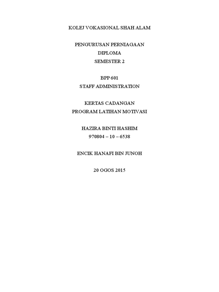 Soo lepas ni adalah paper 2 n. 83 Pengagihan tugas dan taklimat AJK Pelaksana. Program Latihan Seminar Motivasi Pekerja Syarikat Elis 2015 10 Tujuan Tujuan program ini dijalankan adalah untuk.